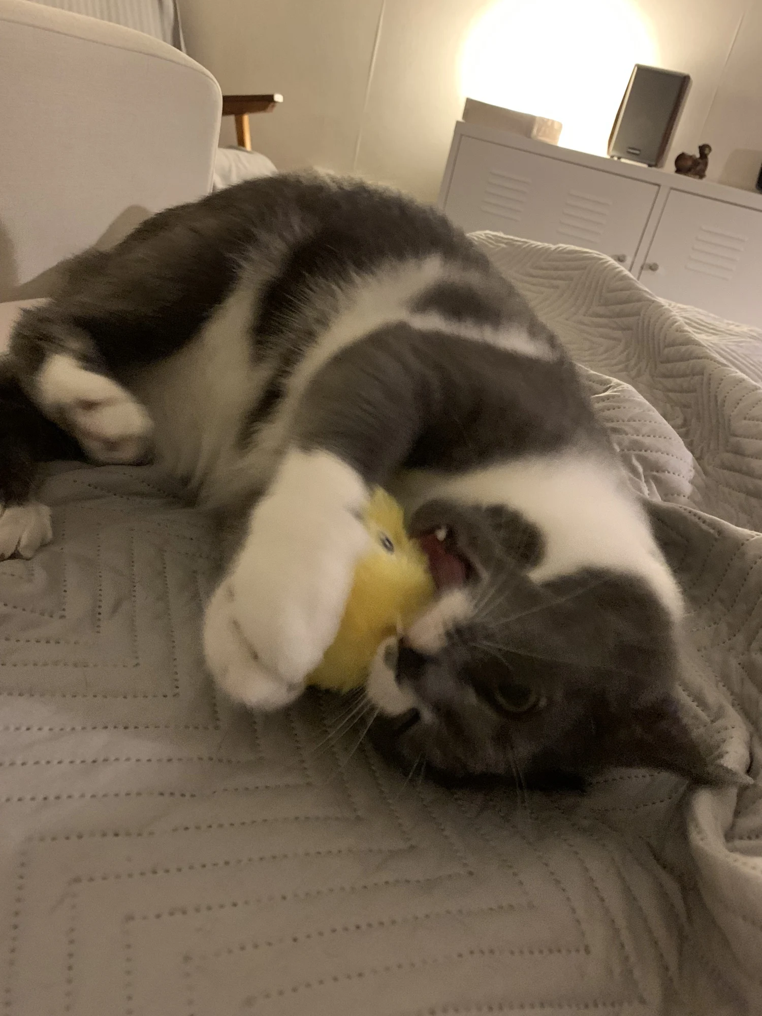 Lilla Kris The ball is cool, furry, chirping. The cat is gambling with him.